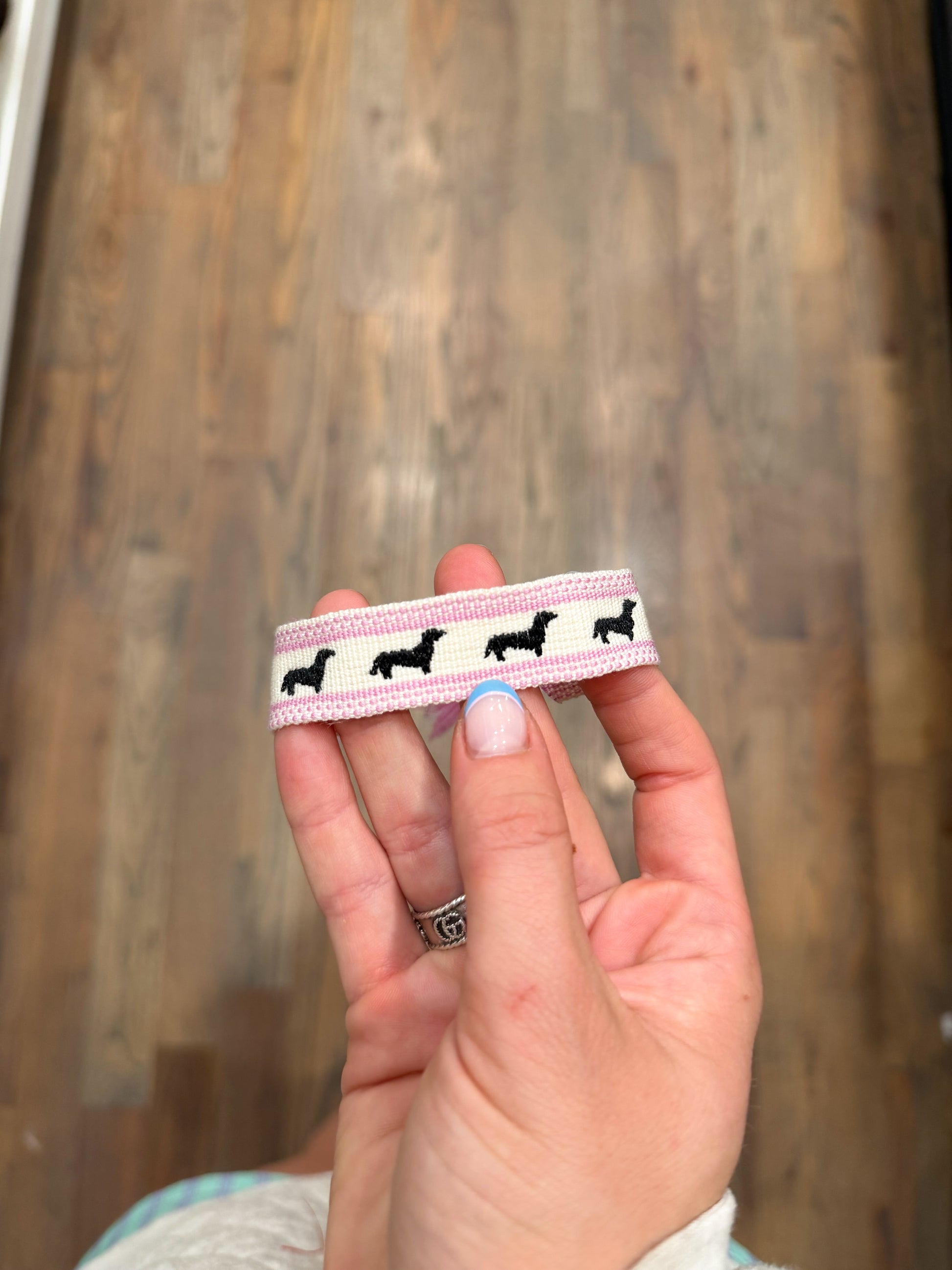 A pink and cream embroidered black dachshund bracelet thats perfect for all the weenie dog lovers!